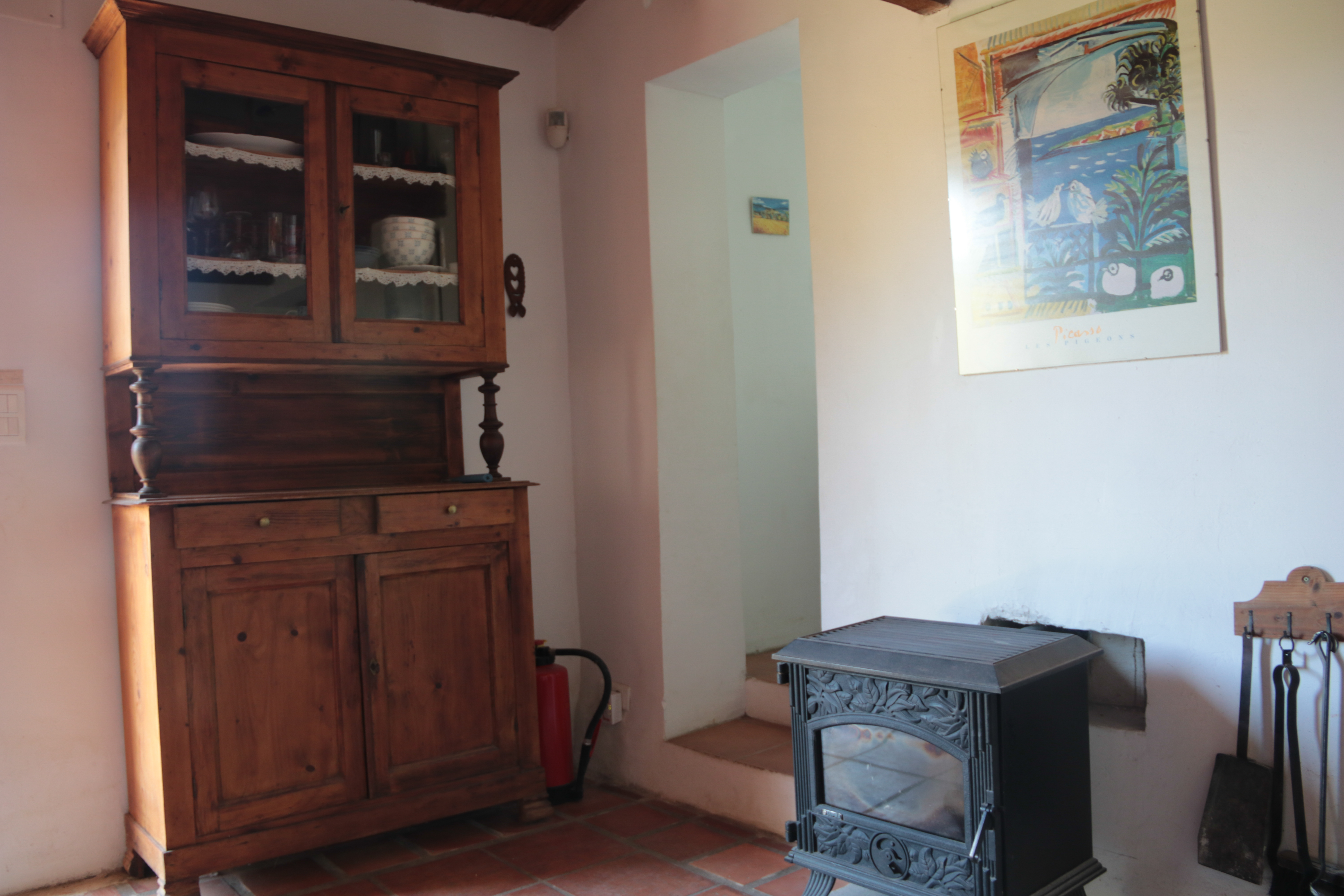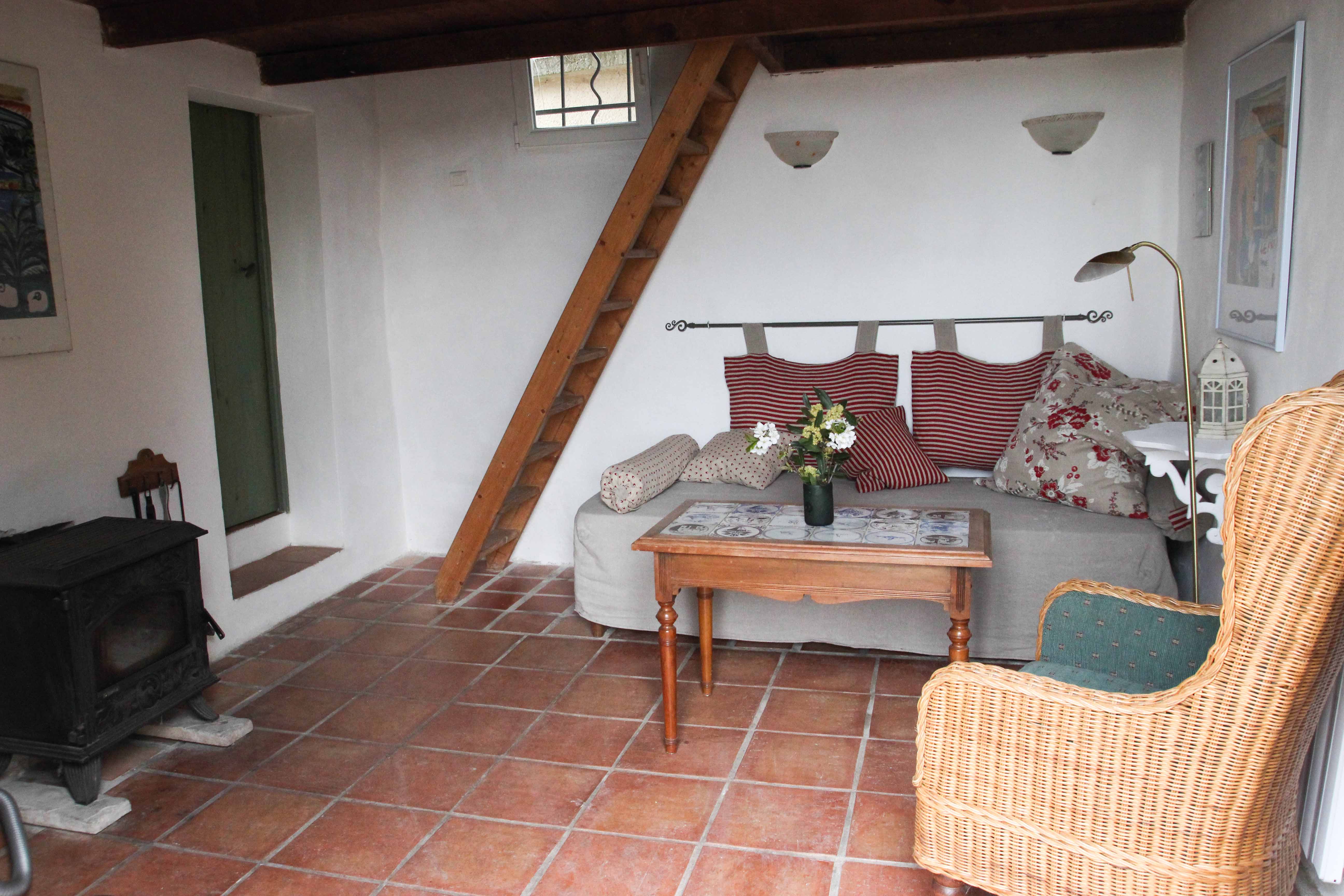 Wohnzimmer: Sitzmöbel, Kaminofen, Zwischenboden mit Matratze (140 cm x 190cm) für ein Kind