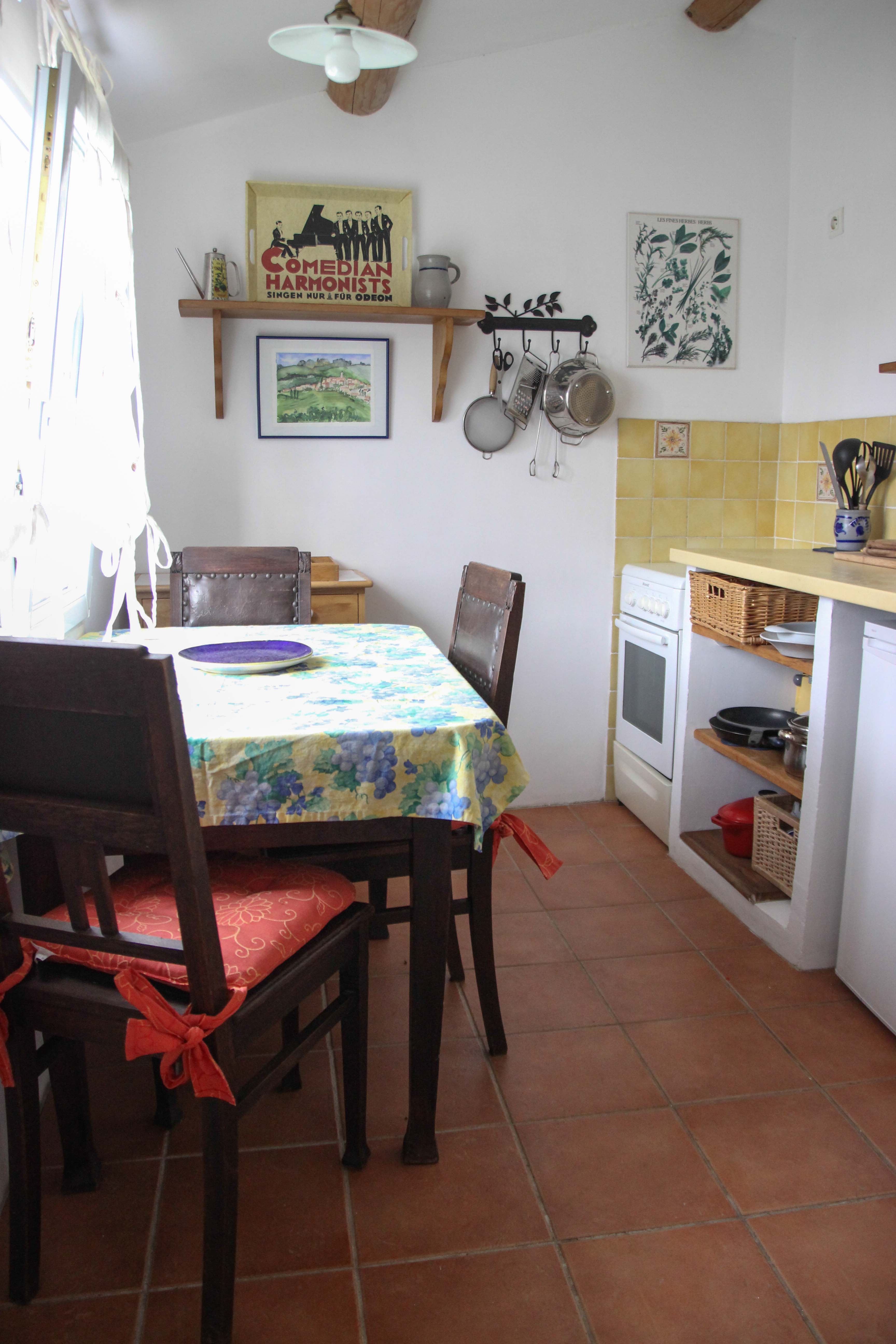 Küche: Esstisch, Kochzeile mit Kühlschrank, Gasherd mit Backofen, Kaffeemaschine, Wasserkocher
