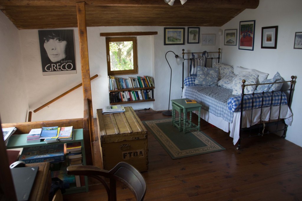 Wohnzimmer OG: Schreibtisch, Metallbett als Sofa, Wäscheschrank