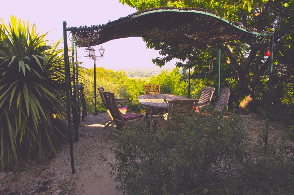 Große überdachte Terrasse vor dem Haus und in der Weinlaube